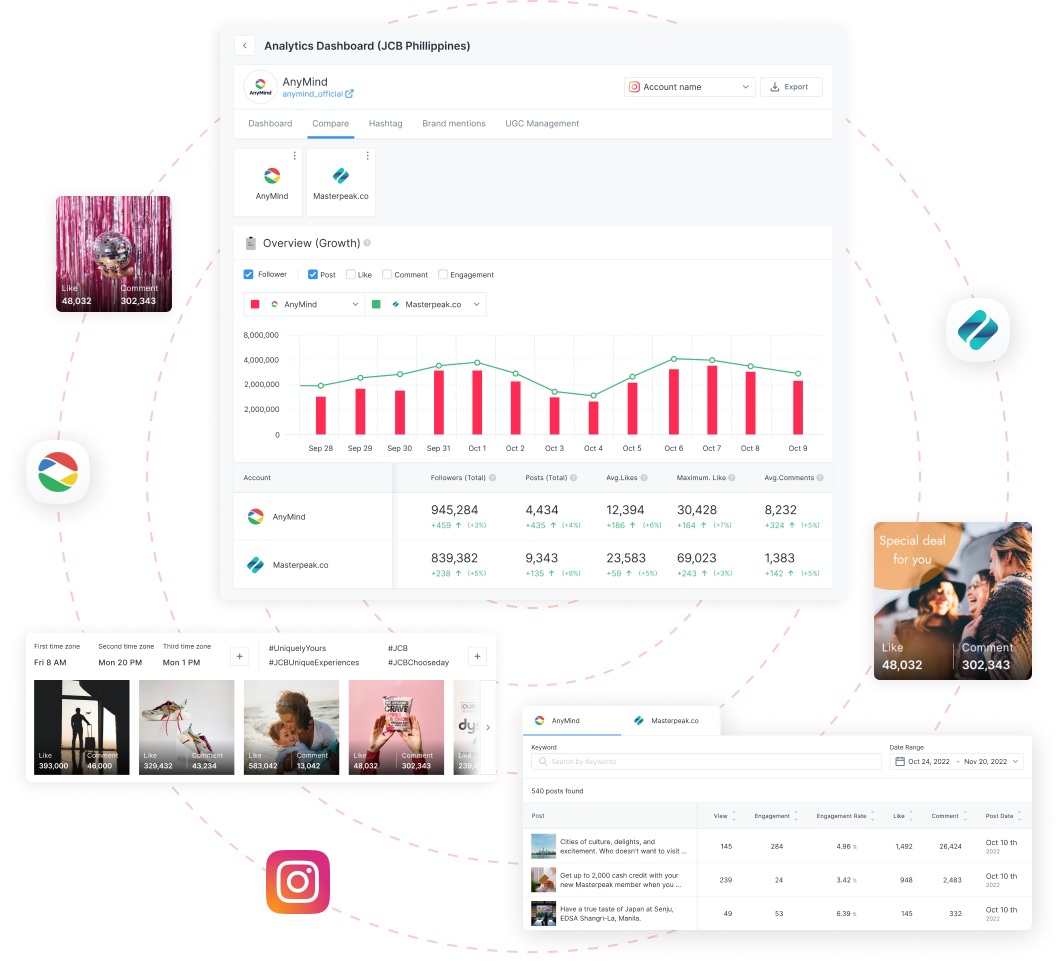 Track effectiveness of your own and your competitors' activities through hashtags and trending keywords.